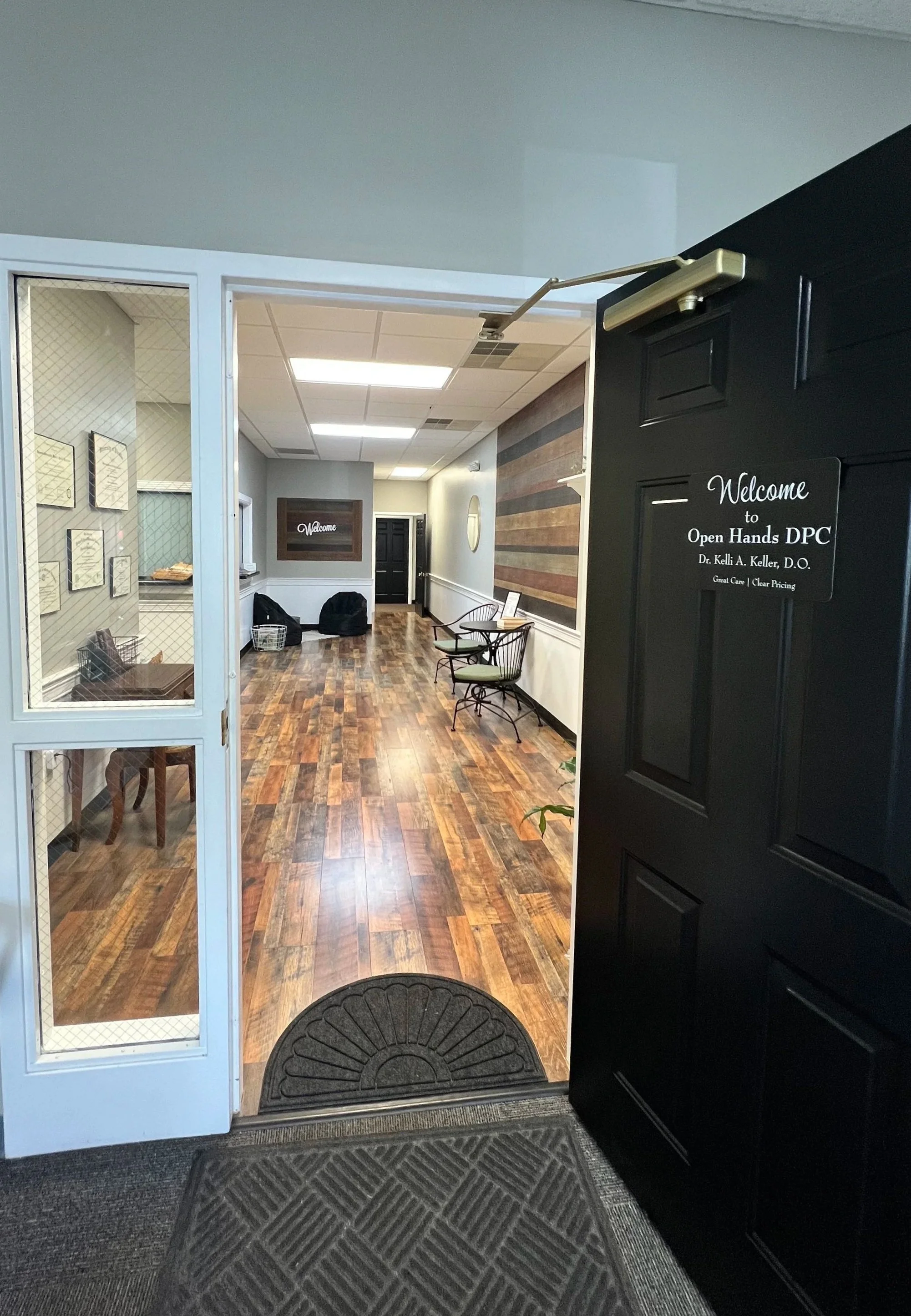 You will enter the exterior through the center white door. If the door is locked, Dr Keller is not in office just yet, but will arrive before your scheduled appointment time. Once you arrive, come in and make yourself comfortable. Dr Keller will greet you directly.
